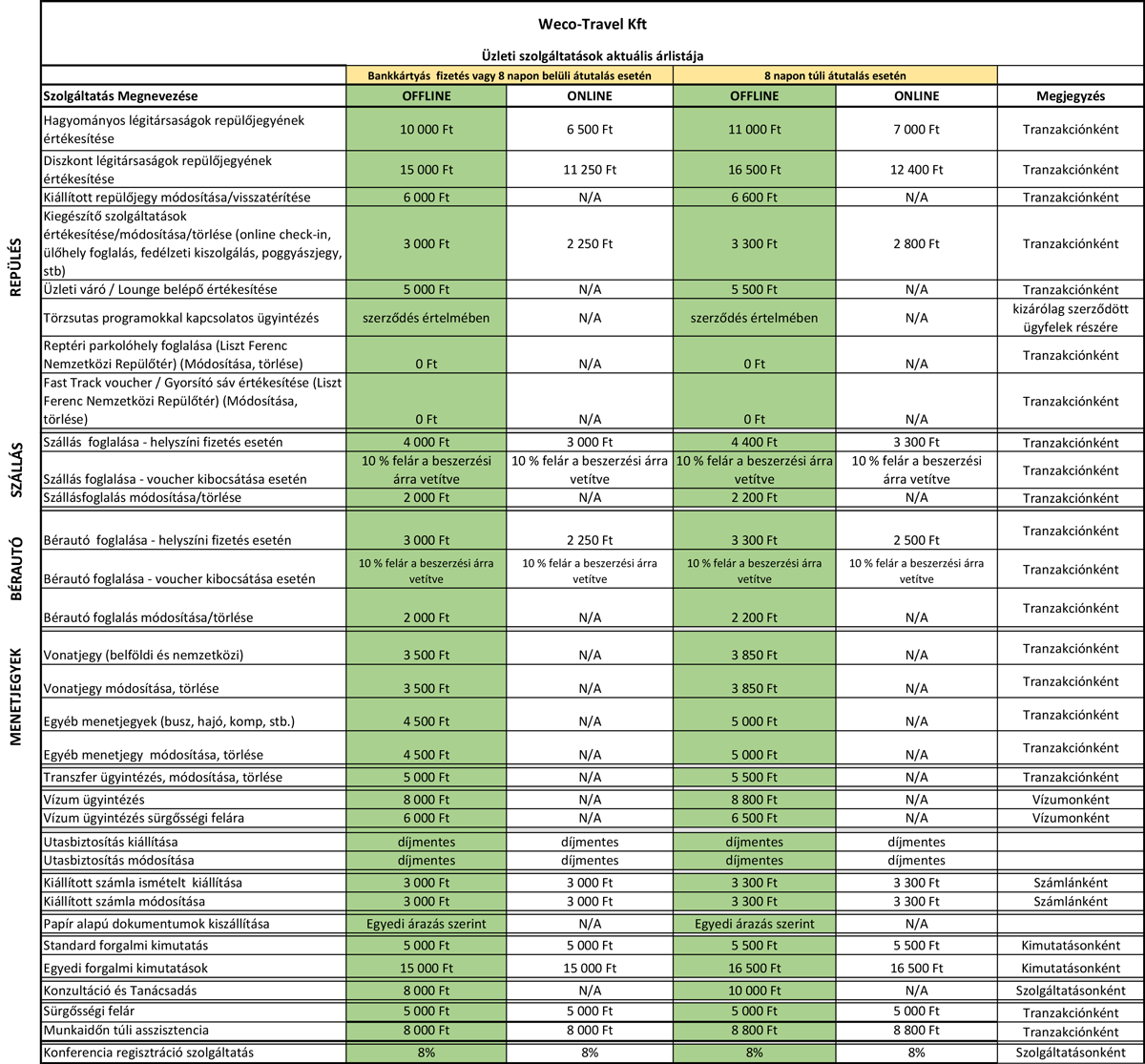 Weco-Travel Kft. Üzleti szolgáltatások aktuális árlistája